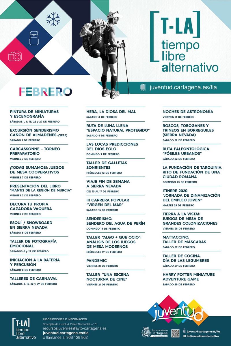 Tiempo Libre Alternativo, de la concejalía de Juventud del Ayuntamiento de Cartagena, ofrece más de 30 actividades para el mes de febrero, en la que podrán participar jóvenes con edades comprendidas entre los 14 a 35 años.