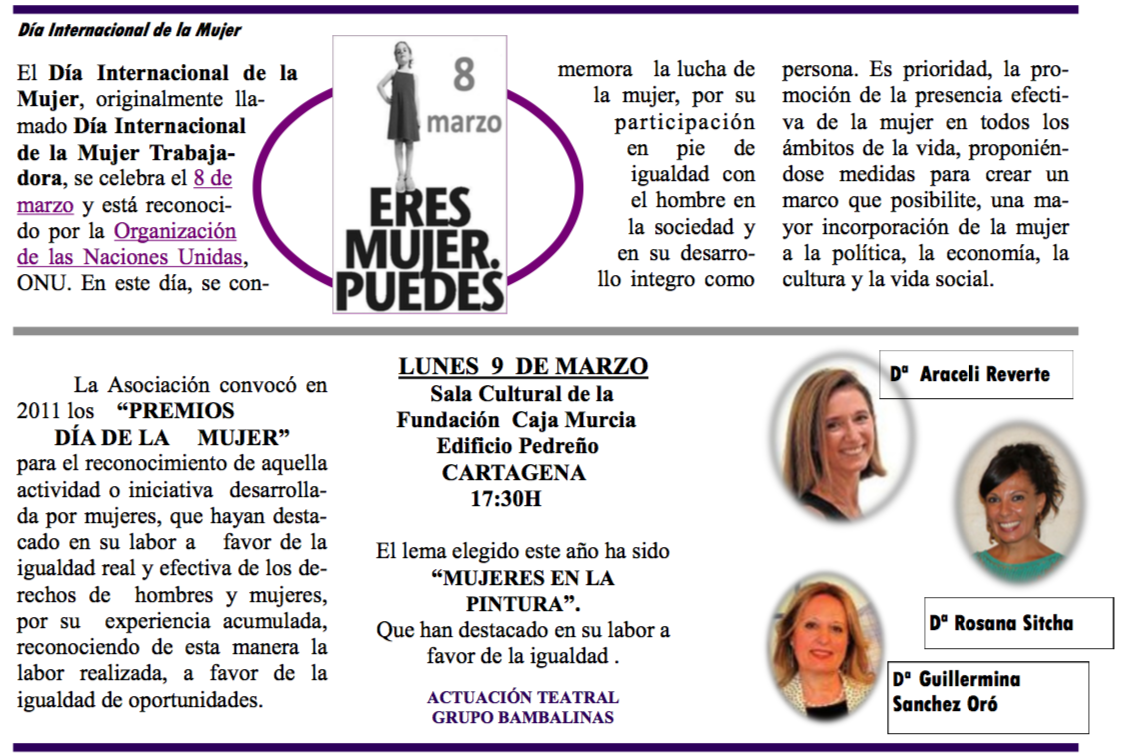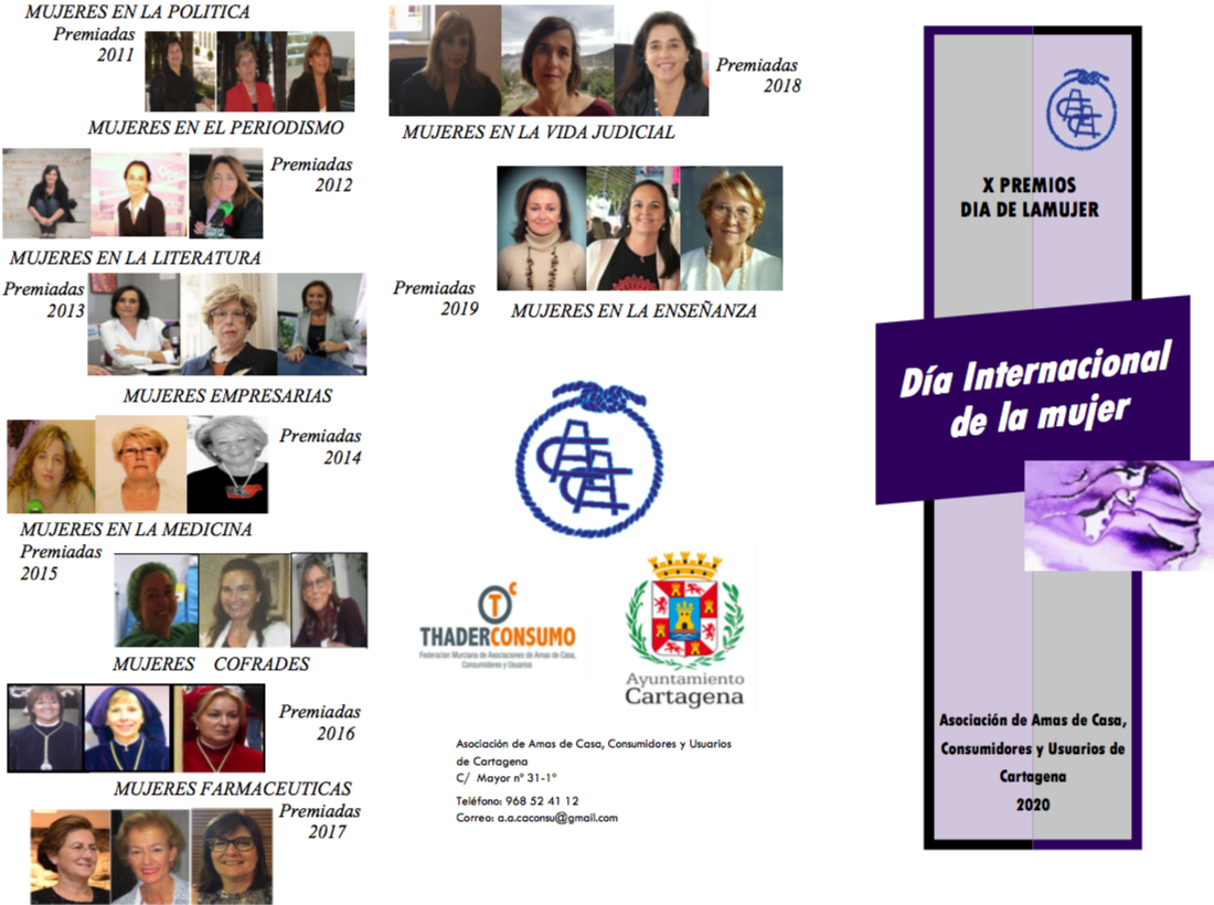 La Asociación de Amas de Casa, Consumidores y Usuarios Cartagena celebra este lunes, a las 17.30 horas en el salón de actos de la Casa Pedreño (Fundación Cajamurcia), con motivo del 'Día internacional de la mujer', la entrega de sus galardones, que alcanzan la décima edición con el lema 'Mujeres en la pintura', pues en esta ocasión distinguen a tres personas que han destacado en las artes plásticas y también en su labor a favor de la igualdad entre sexos. Se trata de Araceli Reverte Bernal, Rosana Sitcha y Guillermina Sánchez Oró, quienes recibirán la distinción de 'Socias de honor'.