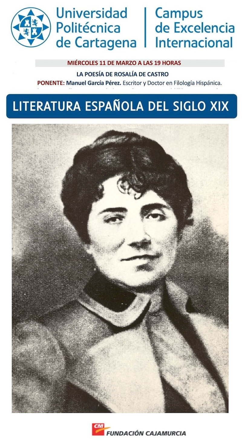 Manuel García Pérez, doctor en Filología Hispánica, profesor y escritor, ofrece un acercamiento a la alta poesía de la autora gallega (Compostela 1837-Padrón 1885) en la quinta conferencia, abierta al público, encuadrada en el ciclo 'Literatura española del siglo XIX', que organiza la UPCT y el campus de Excelencia Internacional. Será esta tarde a las 19 horas. El marco es la Fundación Cajamurcia (Palacio Pedreño).