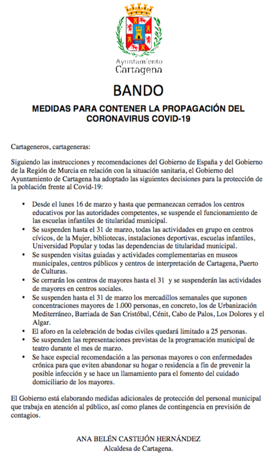 La alcaldesa, Ana Belén Castejón, ha informado de las medidas que el Gobierno municipal está adoptando, de acuerdo con las recomendaciones realizadas anoche por el Gobierno regional y, para contener la propagación del coronavirus en el municipio. Las medidas han quedado reflejadas en un bando de Alcaldía, que suspende actividades de más de 50 personas, cierra escuelas infantiles y mercadillos (Los Dolores, El Algar, Cabo de Palos, San Cristóbal, Urb. Mediterráneo, etc.) y aconseja a los mayores permanecer en casa. También que sólo se celebrarán bodas civiles con 25 invitados.