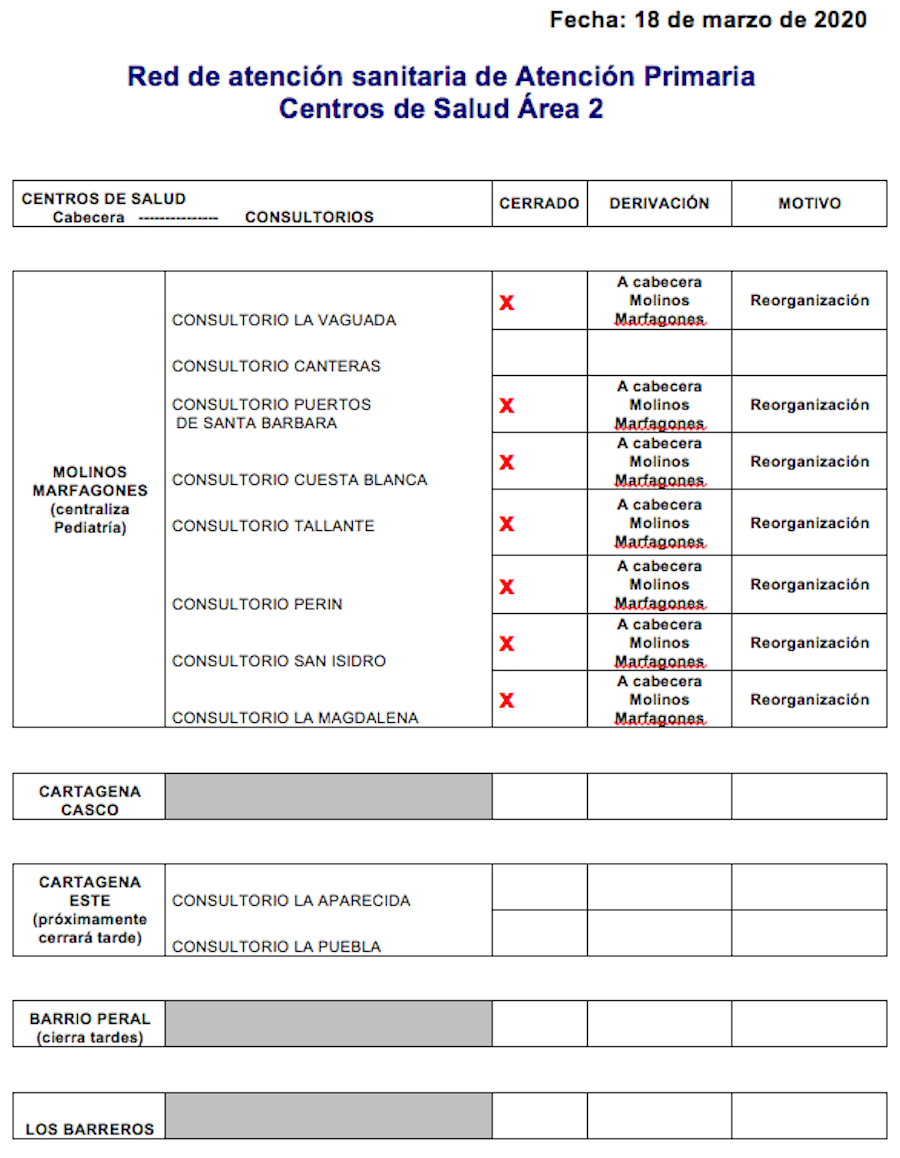 En la cuenta de twiter @Area2Cartagena iremos informando en la medida de lo posible de distintas actuaciones, sujetas a movilidad por el escenario cambiante, que te agradeceríamos nos ayudarás a difundir y consultar como fuente oficial.* Texto remitido en el que se respeta íntegramente contenido, redacción y ortografía, salvo en el titular y en la entradilla del artículoEl Área de Salud de Cartagena reorganiza la atención en centros de salud y consultorios