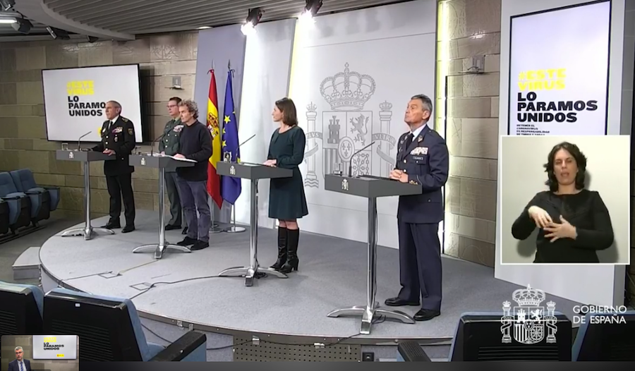 También a tenido lugar en el Palacio de la Moncloa, en Madrid, la rueda de prensa telemática de los responsables técnicos de los Ministerios de Sanidad, de Defensa, del Interior y de Transportes, Movilidad y Agenda Urbana tras la reunión del Comité de Gestión Técnica del Coronavirus, en la que se informado que actualmente hay 19.980 casos (1.141 en UCI), con un incremento de 2.833, un 16,5%, que es menos que en las jornadas anteriores. Se les ha preguntado el motivo por el que España tiene mucha más mortalidad por esta pandemia que Alemania y se ha dicho que es "muy difícil de explicar por nosotros y otros países, que tratamos de resolver".