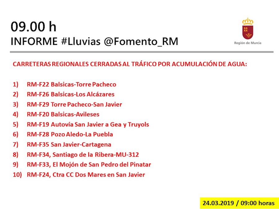 Por otro lado, desde el Área de Salud de la Consejería de Sanidad han comunicado que debido a la situación de alerta y lluvias, el médico y enfermera del consultorio La Puebla no han podido llegar al recinto. Si se presenta algún caso, se atenderá en el centro cabecera Cartagena Este. Se trata de una situación puntual debido al fenómeno atmosférico de hoy.