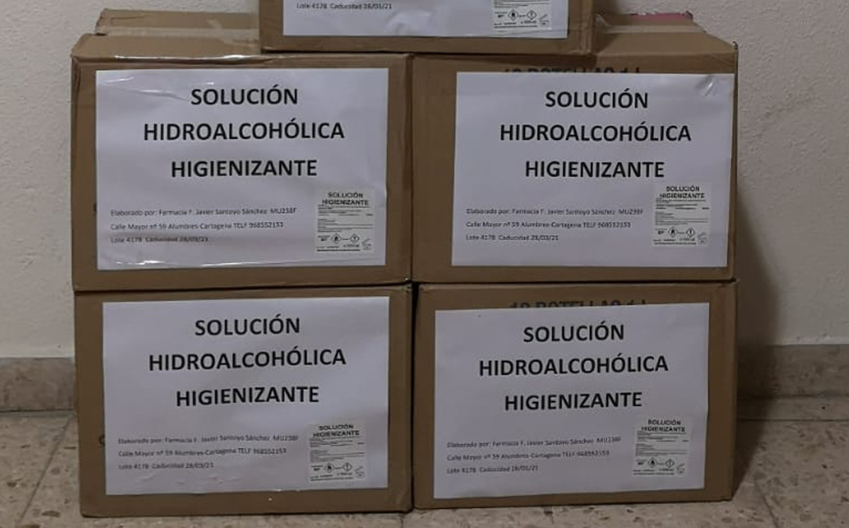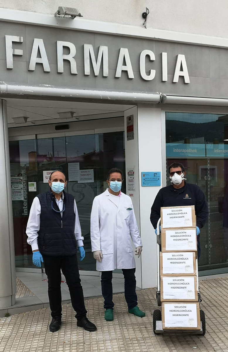 Además, el titular de la Farmacia de Alumbres, Javier Santoyo, entregaba ayer lunes al Ayuntamiento más de sesenta litros de solución hidroalcohólica que ha elaborado en su laboratorio.