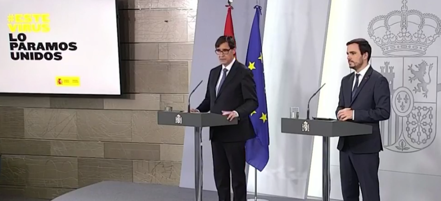 El ministro de Sanidad, Salvador Illa, y el ministro de Consumo, Alberto Garzón, han comparecido en rueda de prensa para dar cuenta de las medidas que están desarrollando en sus departamentos en relación al estado de alarma.