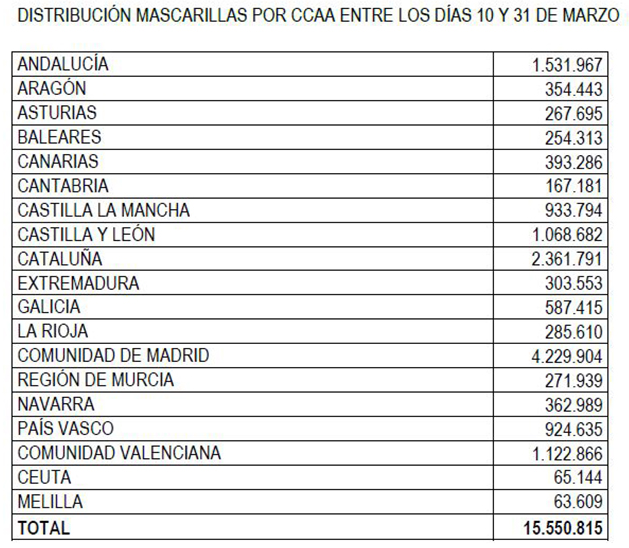 El objetivo del Gobierno es facilitar el material que necesita el conjunto del Sistema Nacional de Salud para librar la batalla contra el virus en las mejores condiciones posibles.El reparto de mascarillas se ha acelerado (con la distribución de más de 5 millones de unidades en las últimas 48 horas) y las autonomías ya han recibido en total 15.550.815 unidades. De esta forma la Comunidad de Madrid ha recibido hasta la fecha 4.229.904 mascarillas, a Cataluña se le han facilitado 2.361.791 mascarillas y Andalucía ha podido disponer de un millón y medio de estas unidades.