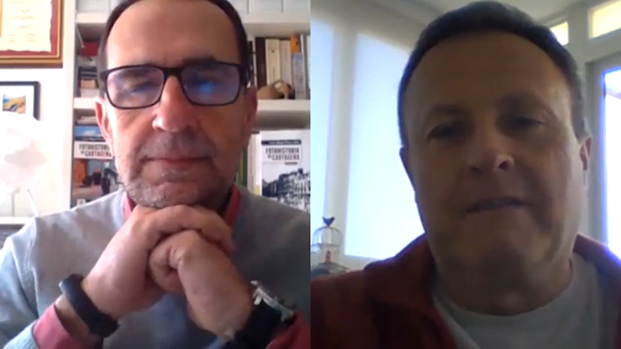 Amena conversación entre dos integrantes del equipo de cronistas oficiales de Cartagena a los que une también su pasión por la historia de esta tierra. El entrevistado expresa su preocupación sobre las consecuencias de la situación actual visto desde la perspectiva de la historia, además de referirse a capítulos del pasado como la mal llamada 'gripe española' de 1918 que afectó a 500 millones de personas y las diferencias con las consecuencias con la sublevación cantonal y la Guerra Civil españolas.