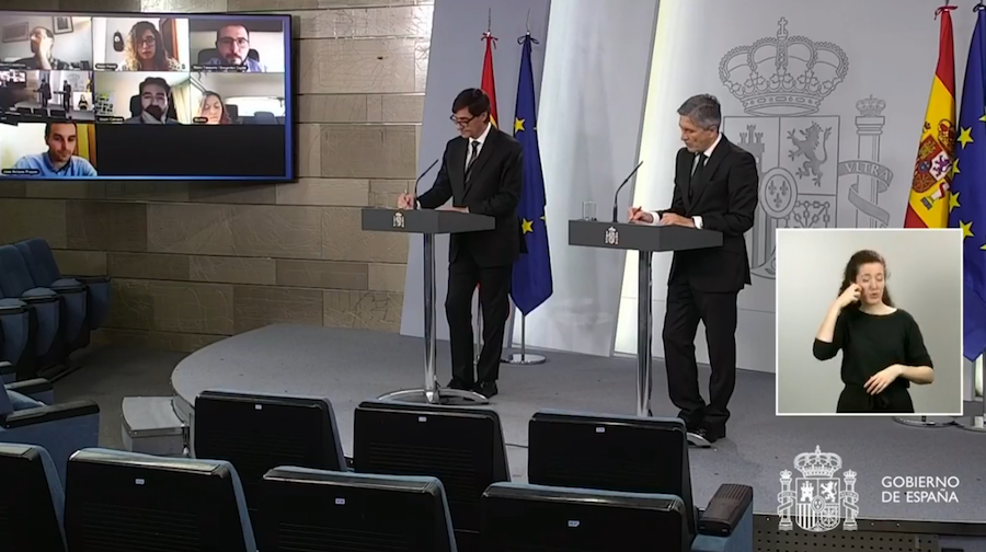 Ambos ministros han comparecido hoy desde La Moncloa para dar cuenta de las medidas que están desarrollando en sus departamentos en relación al estado de alarma. Para ver y escuchar íntegra la rueda de prensa: pinchar sobre la imagen