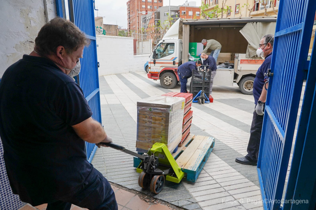 En esta ocasión entregaban en el pabellón central de Deportes 800 kilos de arroz, tomate, atún y pasta, que el Ayuntamiento de Cartagena hará llegar a las personas en situación de vulnerabilidad social y más afectadas por los efectos de la Pandemia.