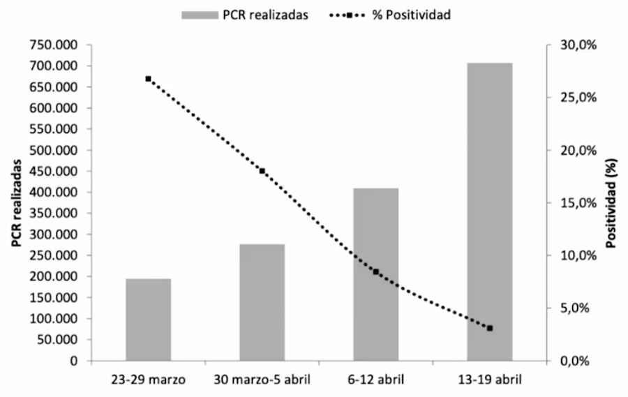 Con más de 700.000 PCR la pasada semana, el porcentaje de positivos es del 3,1%, frente al 26,1% de finales de marzo, con 200.000 PCR.