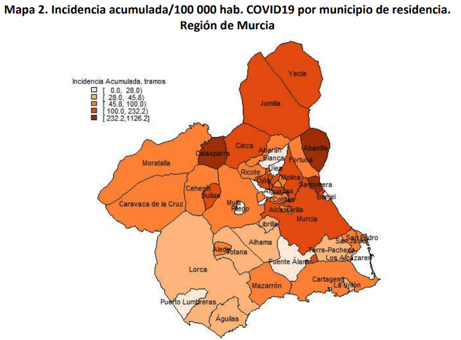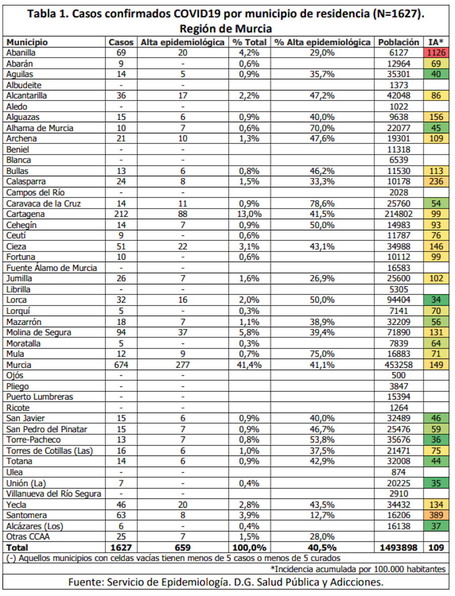 El municipio alcanza la cifra de 212 personas afectadas por el Covid-19, según los datos del informe detallado del Servicio de Epidemiología de la Región de Murcia con los datos del pasado domingo.