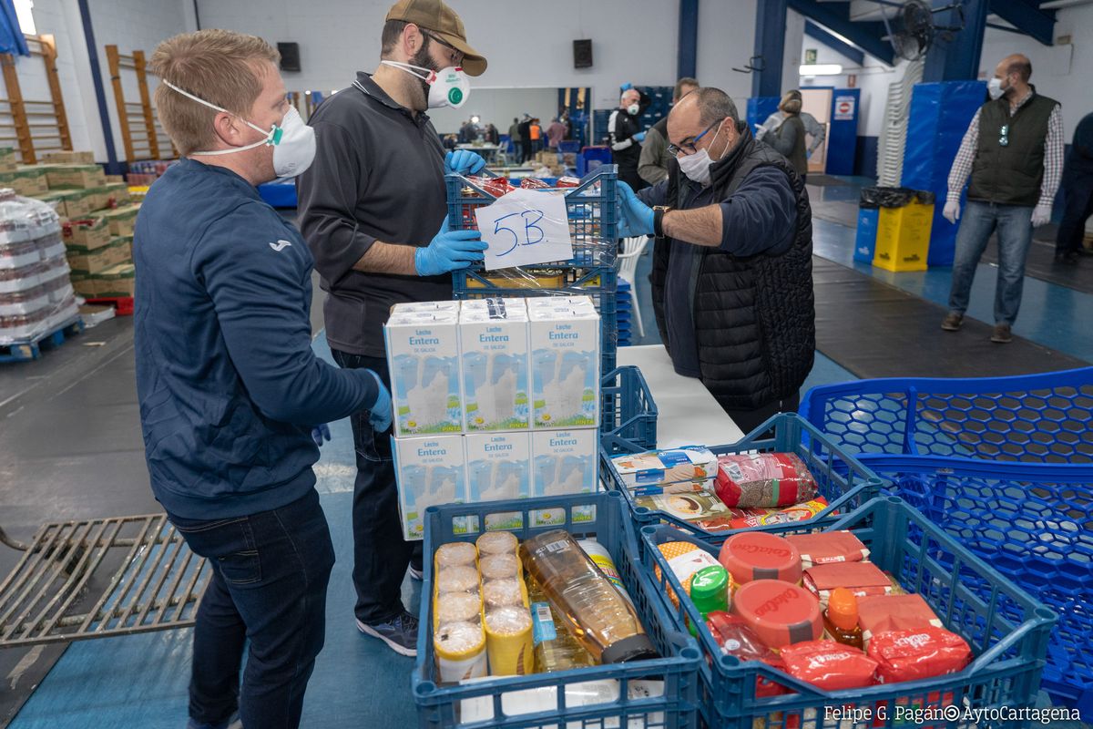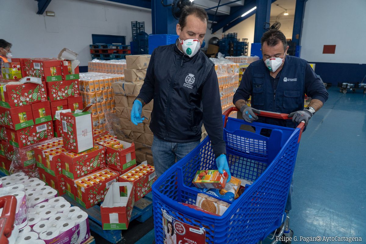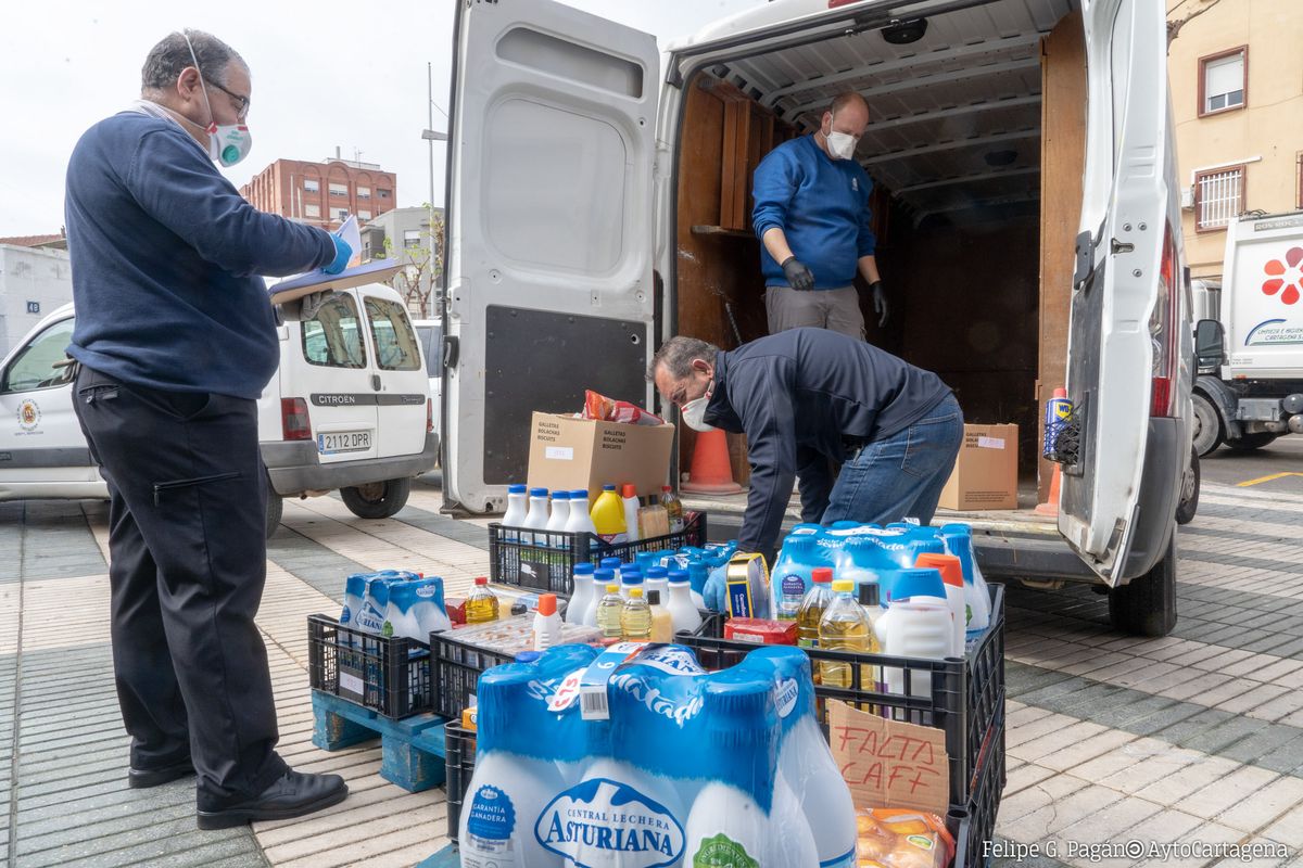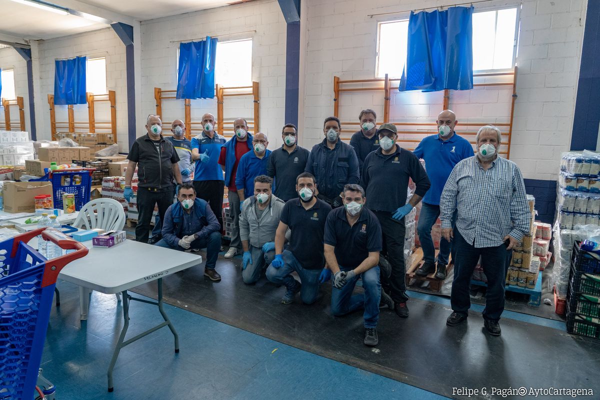 Desde las funcionarias de Juventud, Igualdad y Educación que se encargan de coger las llamadas diarias al Teléfono Social Único (968021123), a los trabajadores de Deportes, Juventud, conserjes o personal de Infraestructuras que descargan los pallets y que, junto a los voluntarios del Banco de Alimentos, elaboran los lotes de alimentos para cada familia, y terminando por los voluntarios de Policía Local, Protección Civil, la Armada y del Tercio de Levante que se encargan de la distribución a domicilio. Todos ellos de la mano del equipo de Servicios Sociales.