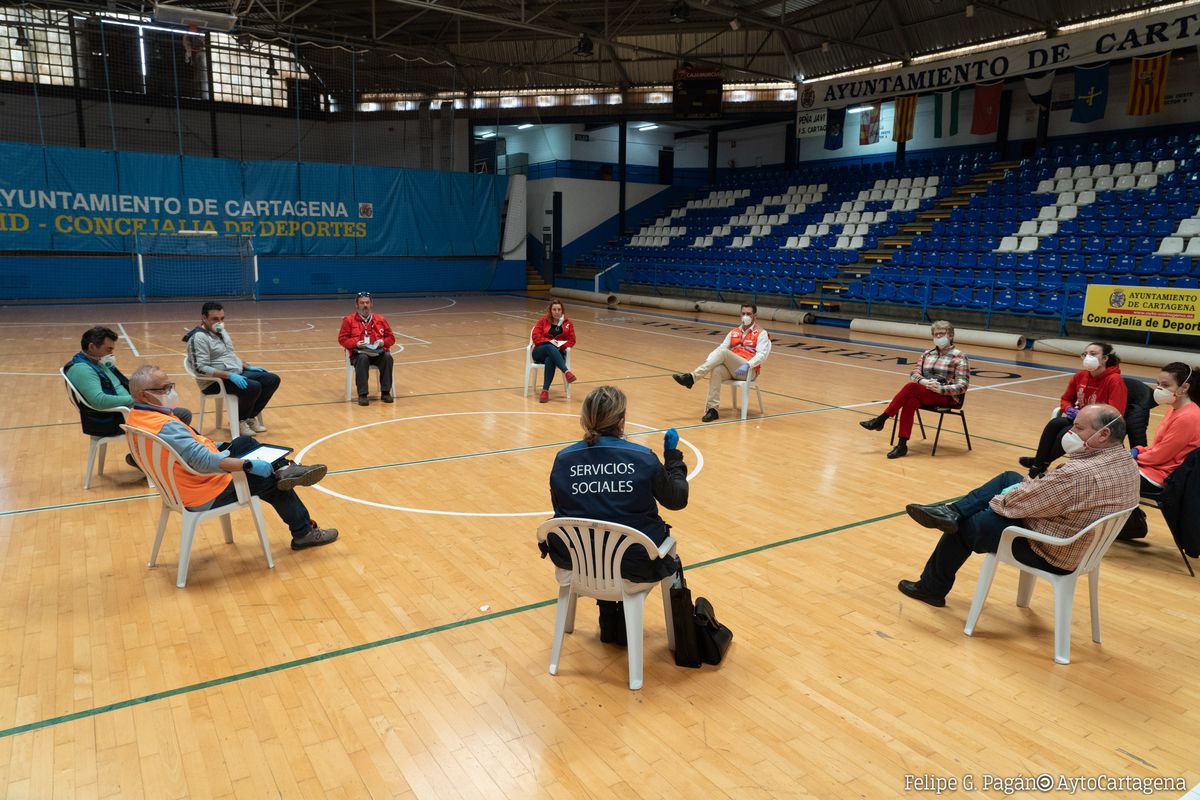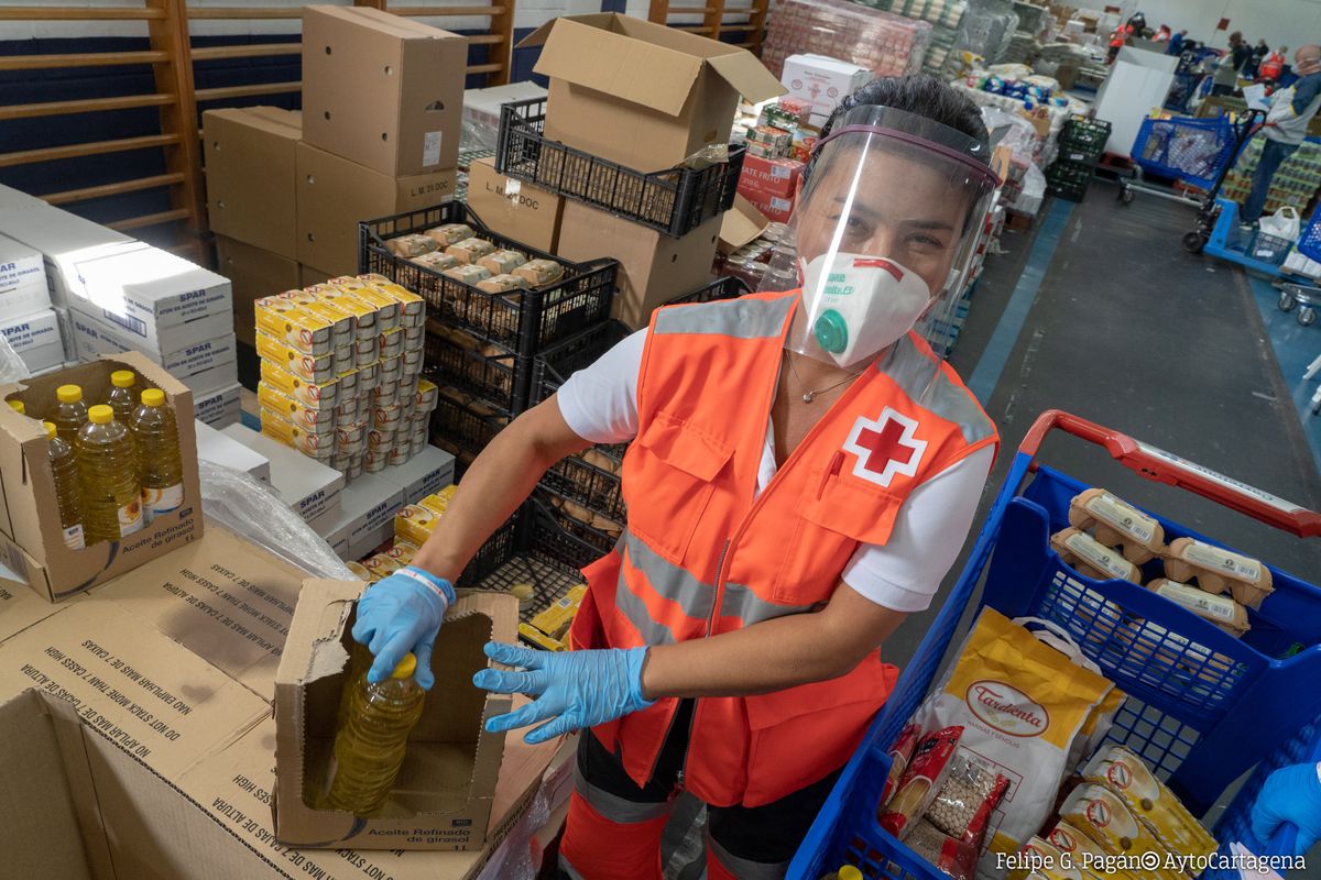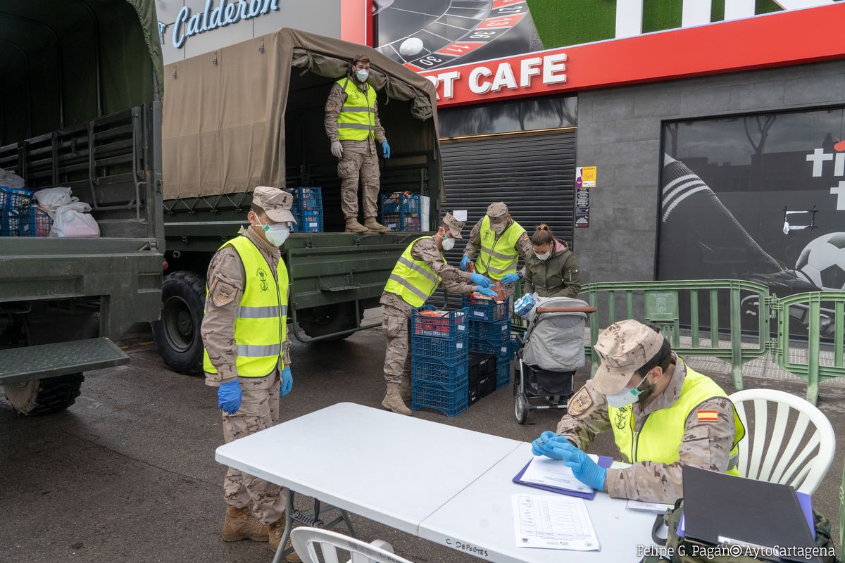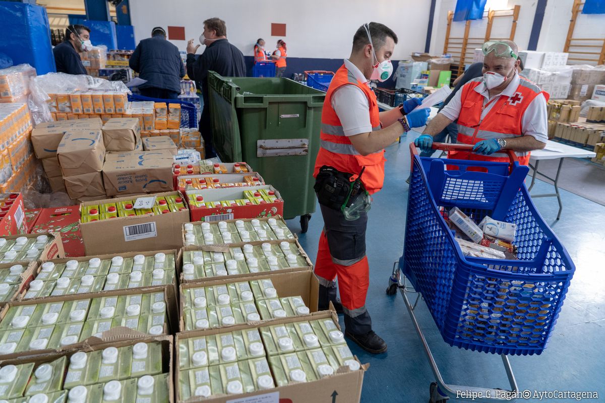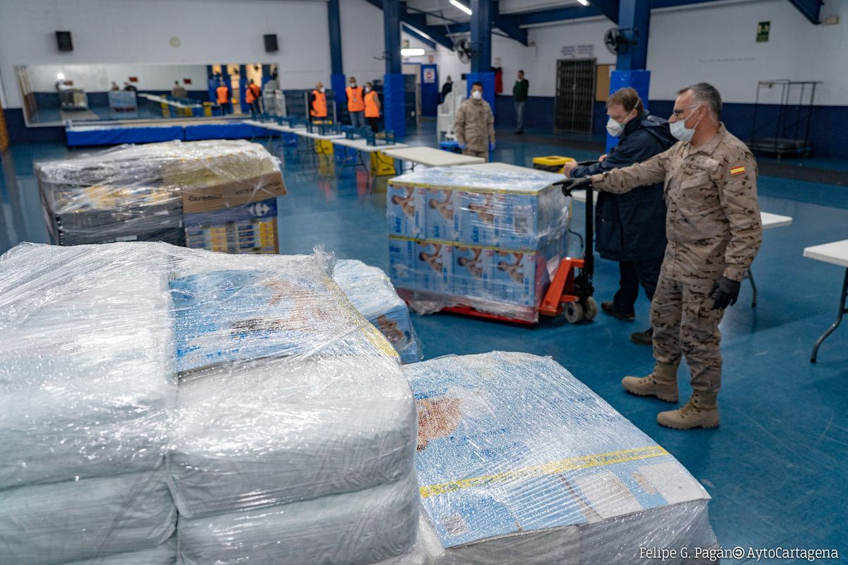 Desde las funcionarias de Juventud, Igualdad y Educación que se encargan de coger las llamadas diarias al Teléfono Social Único (968021123), a los trabajadores de Deportes, Juventud, conserjes o personal de Infraestructuras que descargan los pallets y que, junto a los voluntarios del Banco de Alimentos, elaboran los lotes de alimentos para cada familia, y terminando por los voluntarios de Policía Local, Protección Civil, la Armada y del Tercio de Levante que se encargan de la distribución a domicilio. Todos ellos de la mano del equipo de Servicios Sociales.