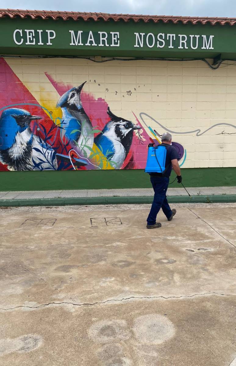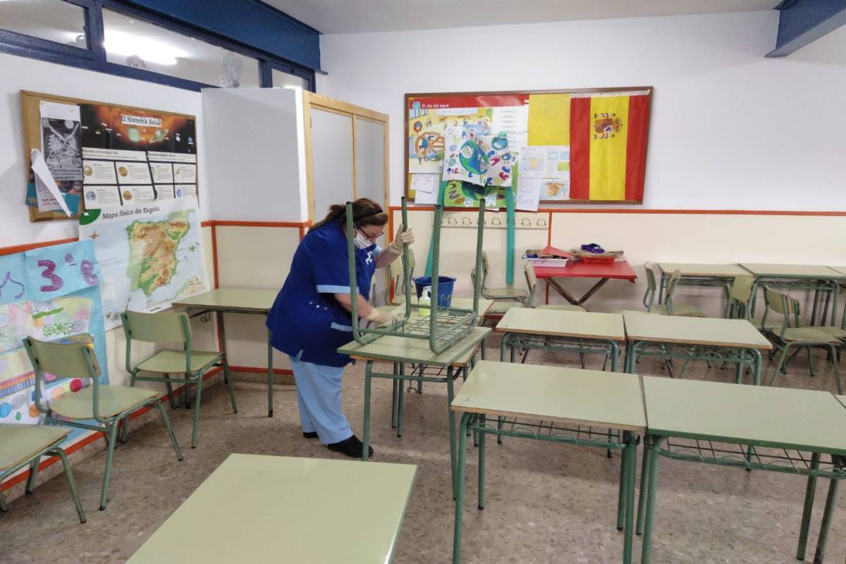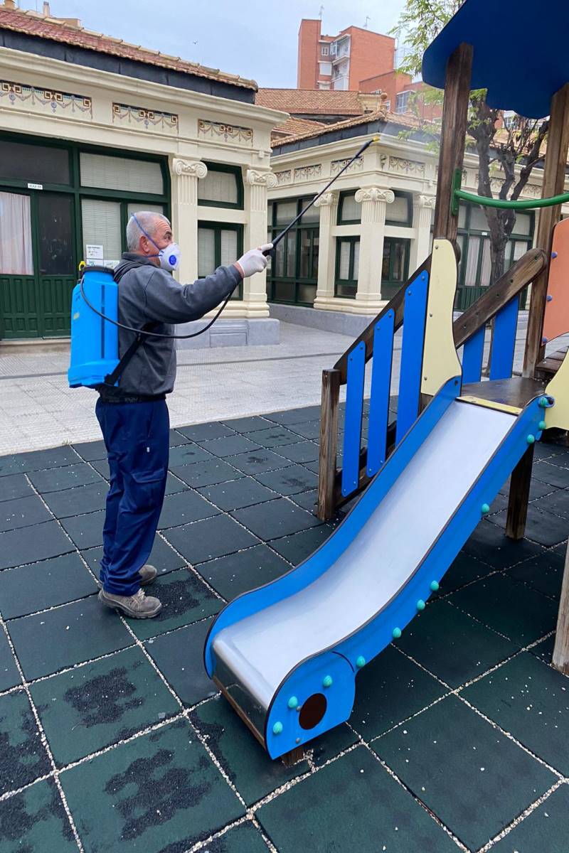 El Ayuntamiento de Cartagena está acometiendo trabajos de desinfección intensa en los colegios y centros educativos de titularidad municipal. La totalidad de los edificios de titularidad municipal, destinados a Educación Infantil, Primaria y Educación Especial están siendo sometidos a estas labores, dentro de las acciones que se llevan a cabo para mantener el municipio limpio y desinfectado durante la pandemia del Covid-19.Así, empleados y empleadas de la empresa concesionaria de limpieza de centros educativos municipales dependientes de la Concejalía de Educación, están trabajando en la desinfección y mantenimiento de los centros. Por este motivo, las labores de desinfección están siendo continuas e incluyen tanto los espacios interiores de los edificios, como aulas y pasillos, como los exteriores, de manera que patios y zonas de juego y deportivas de los colegios también están siendo sometidas a tratamiento.