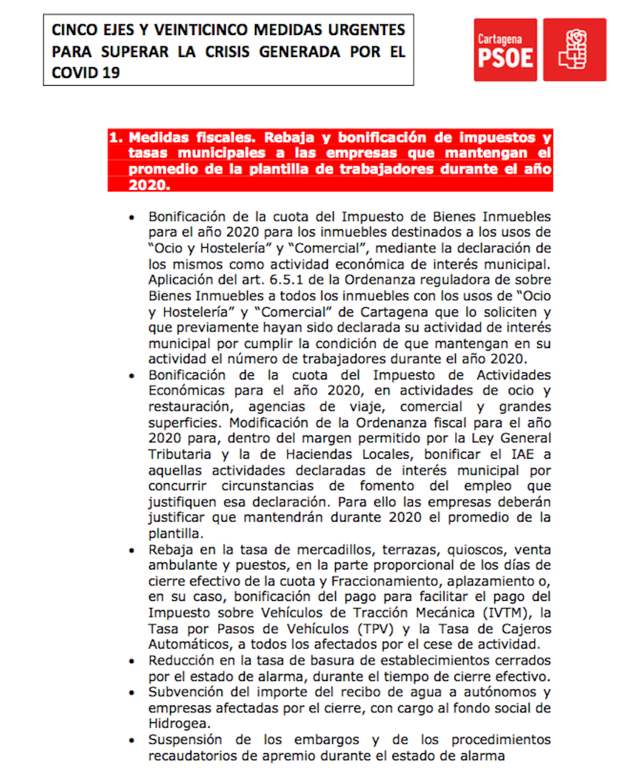 Los socialistas de Cartagena han dado a conocer el paquete de actuaciones sociales y de impulso a la economía que giran en torno a cinco ejes y con los que calculan que habrá salida para la grave situación. Manuel Torres, su secretario general, exige al gobierno municipal que utilice "todo el dinero disponible para que nadie se quede atrás".Esta mañana ha sido presentado en rueda de prensa el documento, trabajado por toda la ejecutiva municipal del PSOE en Cartagena junto a colectivos de la sociedad civil, que contiene los 5 ejes y las 25 medidas que consideramos imprescindibles y de aplicación inmediata por parte del gobierno municipal para poder ayudar a superar la crisis económica y social provocada por el COVID19 en el municipio.