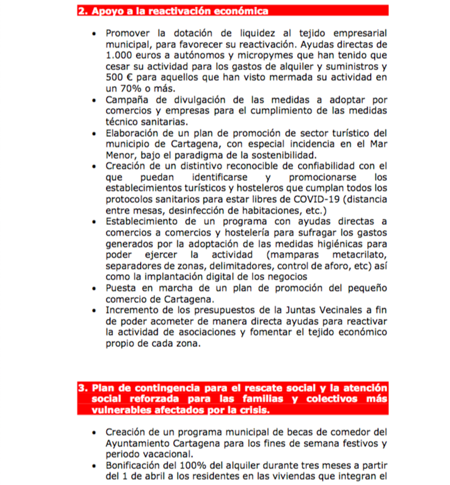 El PSOE de Cartagena considera que estas dos medidas son fundamentales para ayudar a los autónomos y pequeños empresarios a salir de la difícil situación provocada por la crisis sanitaria, y propone una dotación de ayudas directas de 1.000 euros a autónomos y micro pymes que han tenido que cesar su actividad para los gastos de alquiler y suministros y 500 € para aquellos que han visto mermada su actividad en un 70% o más.