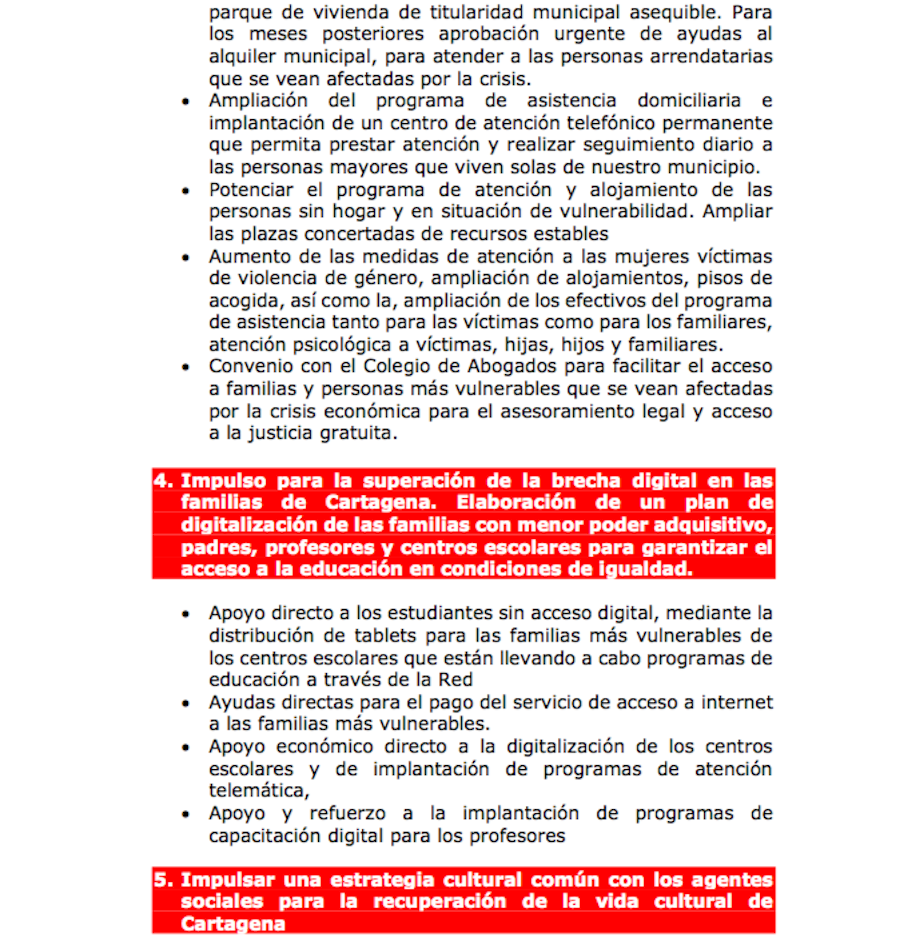 En estos momentos en que se ha puesto de manifiesto las diferencias entre quienes tienen a acceso a medios digitales y los que no, el PSOE de Cartagena apuesta por superar la brecha digital en las familias de Cartagena, para lo que propone la distribución de tablets para las familias más vulnerables de los centros escolares que están llevando a cabo programas de educación a través de Internet, junto a ayudas directas para el pago del servicio de acceso a internet para estas familias.