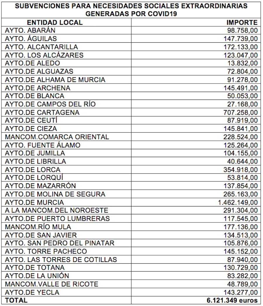 707.258 euros para ayudar a las familias de La Unión a combatir los efectos de la Covid-19
