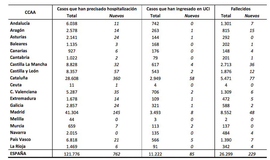 Casos totales: 222.857. Últimas 24 horas (PCR): 1.095. Recuperados: 131.148. Fallecidos: 26.299 (229 en el último día).- El Estado rechaza que Madrid pase a la Fase 1