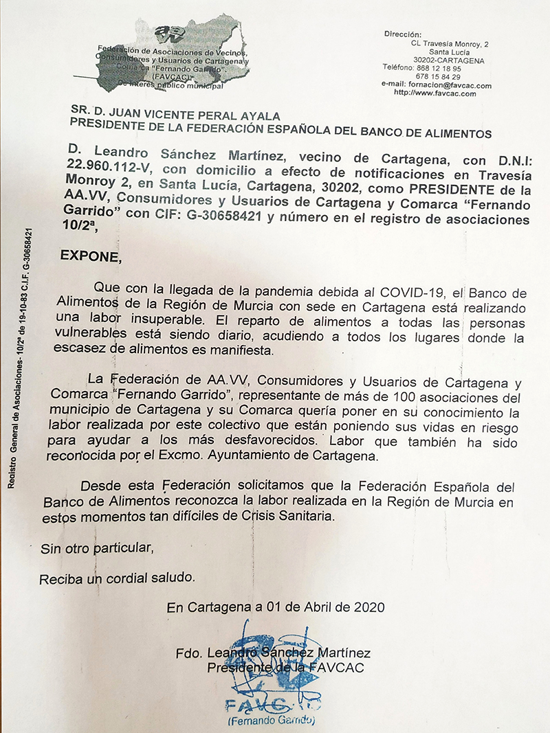 La Federación de Asociaciones de Vecinos de Cartagena y Comarca, en nombre de su más de cien asociados, ha remitido al presidente nacional de la solidaria institución un escrito en el que se califica como "insuperable" la labor que está llevando a cabo el equipo de trabajo de Cartagena, cuyos integrantes "están poniendo en riesgo sus vidas para ayudar a los más desfavorecidos", pidiendo a la Federación Española que también lleve a cabo un reconocimiento de esa labor.