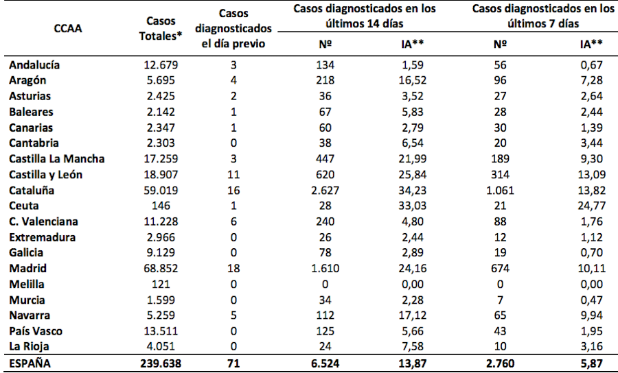 El director del Centro de Coordinación de Alertas y Emergencias Sanitarias, Fernando Simón, ha informado que en el último día se ha dado 71 casos (cifra inferior al día anterior que fueron 96 y la más baja desde el 6 de marzo) y que en los últimos 7 días la cifra es de 278. Hospitalizados son 245 y en UCI han entrado 9 personas. En cuanto a fallecidos, en las últimas 24 horas no se han notificados muertes con fecha de defunción del domingo. En cuanto a las cifras acumuladas, el total de casos diagnosticados en España se sitúa en 239.638 y el de fallecidos en 27.127.