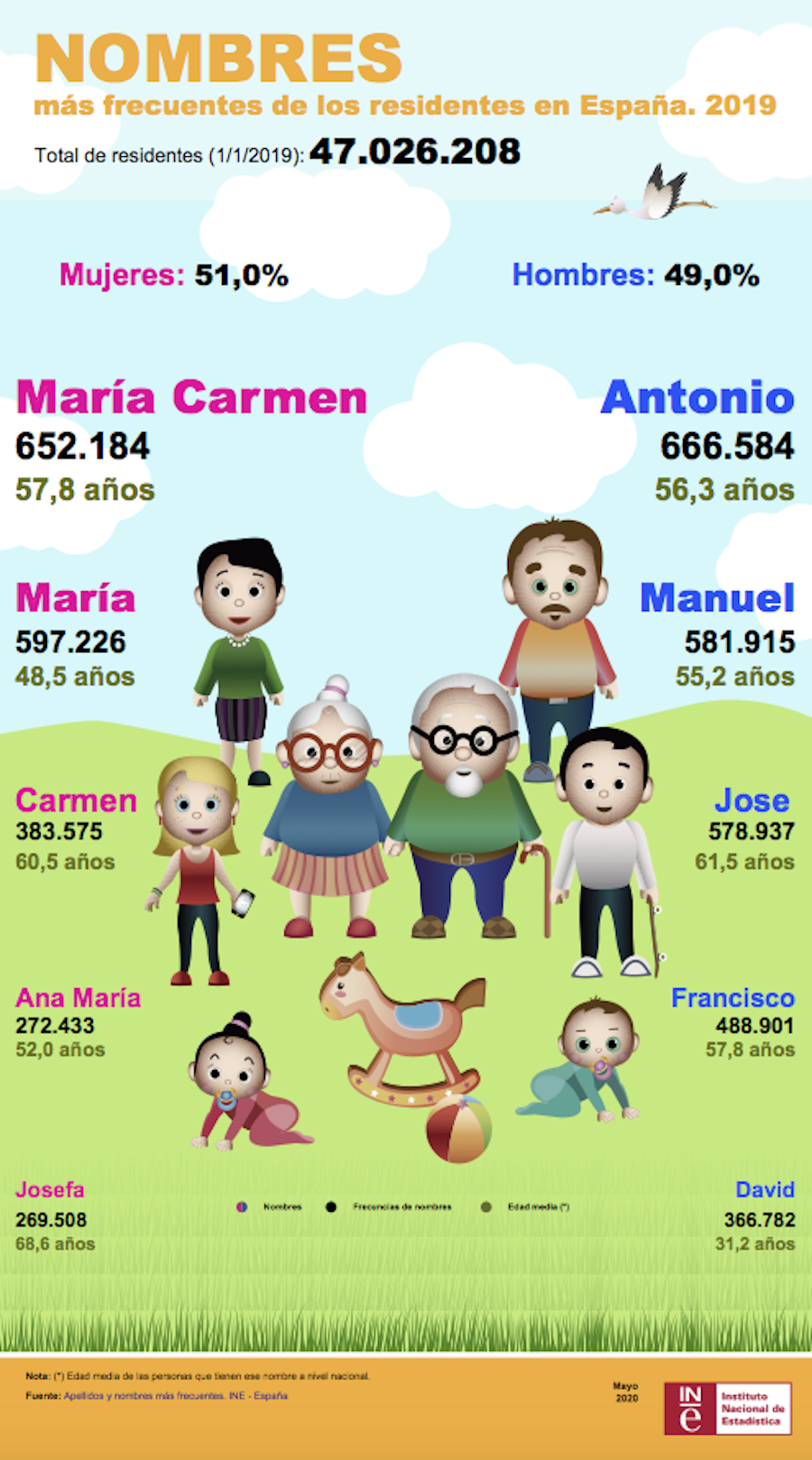 En 2019 los recién nacidos fueron 359.770, siendo Lucía y Hugo, al igual que en el año anterior, los más usuales. Sofía, Martina, María, Julia, Paula, Emma, Daniela, Valeria y Alba ocupan, respectivamente, las siguientes plazas. Destacar que Lucía ocupa el primer puesto desde hace 16 años. En cuanto a niños, Hugo sigue primero, seguido por Marttín, Lucas, Mateo, Leo, Daniel, Alejandro, Pablo, Manuel, Álvaro y Adrián. Hay datos significativos como que José (‘Pepe’) fue en el siglo XX el más popular de los españoles y ahora está en el número 40 de los recién nacidos.