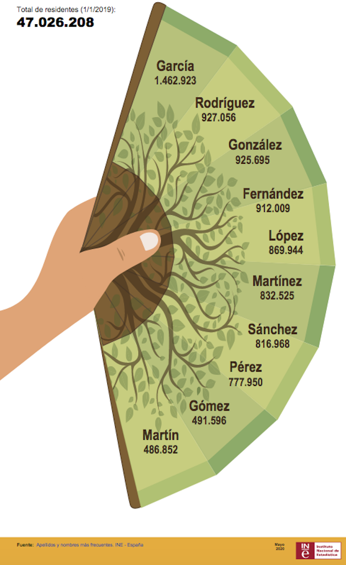 En el capítulo de apellidos el gran dominio es de García (1.462.923) seguido por Rodríguez (927.056), González (925.695), Fernández, López, Martínez, Sánchez, Pérez, Gómez y Martín.