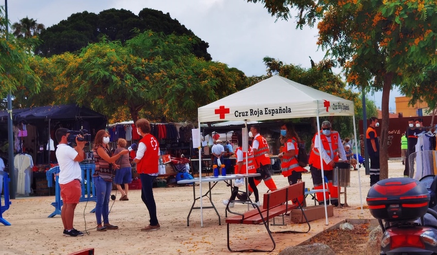 Voluntarios de Cruz Roja Cartagena han iniciado en Barrio Peral una campaña, en colaboración con el Ayuntamiento, cuya esencia es explicar a la ciudadanía determinadas normas adoptadas tras el confinamiento por la pandemia, como el lavado correcto de manos, el uso de los geles y mascarillas y el distanciamiento social, entre otros.
