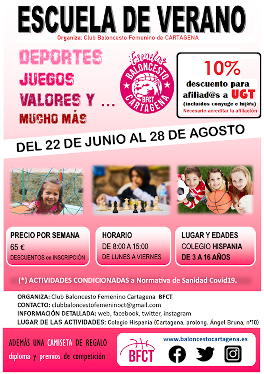 La escuela de verano del BFCT comienza el día 22 Detalles Escrito por CTH10. 14 de junio de 2020, domingo Organizada por el Club Baloncesto Femenino de Cartagena, se va a desarrollar con menos de 3 a 16 años de edad hasta el 28 de agosto en el colegio Hispania y cuenta con la colaboración de UGT. Inscripción: pinchar aquí Anterior Siguiente share with Whatsapp Send by email powered by social2s
