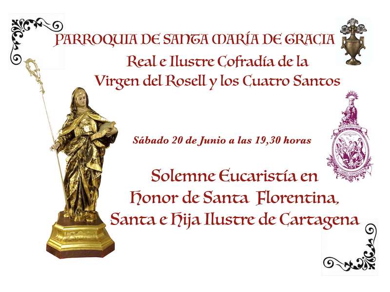 La Real e Ilustre Cofradía de la Virgen del Rosell y los Cuatro Santos organiza este próximo sábado, a las 19.30 horas, la eucaristía dedicada a la santa e hija ilustre de Cartagena, que tendrá lugar a las 19.30 horas en la iglesia de Santa María de Gracia, en la ciudad de Cartagena.
