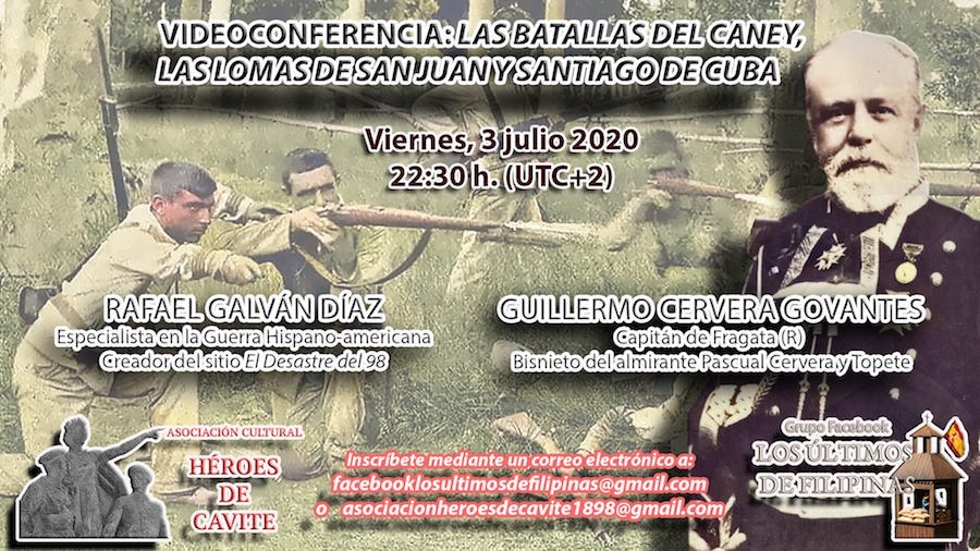 La asociación cultural que lleva el nombre que recuerda a los españoles fallecidos en la 'Guerra de Cuba' frente a Estados Unidos, en 1898, organiza este viernes un acto en memoria a los soldados y misiones caídos por España o en su labor de ayuda al prójimo, que se extiende en esta ocasión a las víctimas del coronavirus y que también se lleva a cabo en defensa de la historia de España y de sus monumentos. Tendrá lugar este viernes, 3 de julio, a las 20 horas en la plaza que acoge el monumento de Héroes de Cavite de Cartagena. La jornada se completa con una videoconferencia por la noche.Por la noche, a las 22.30 horas, tendrá lugar la videoconfenecia 'Las batallas del Caney, Las Lomas de San Juan y Santiago de Cuba', a cargo de Rafael Galván, especialista en la guerra hispano-americana, y Guillermo Cervera, capitán de fragata y bisnieto del almirante Pascual Cervera y Topete. Organizan la asociación cultural Héroes de Cavite y el grupo de Facebook 'Los últimos de Filiñinas'. La inscripción se puede efectuar en los correos electrónicos: