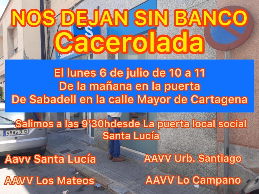Los vecinos de Santa Lucía, Los Mateos, Urbanización Santiago y Lo Campano expresarán de esa forma, ante la sede principal de la calle Mayor de Cartagena, su malestar por quedarse la Villa y Condado sin oficinas bancarias y esperan que la dirección de la entidad rectifique.