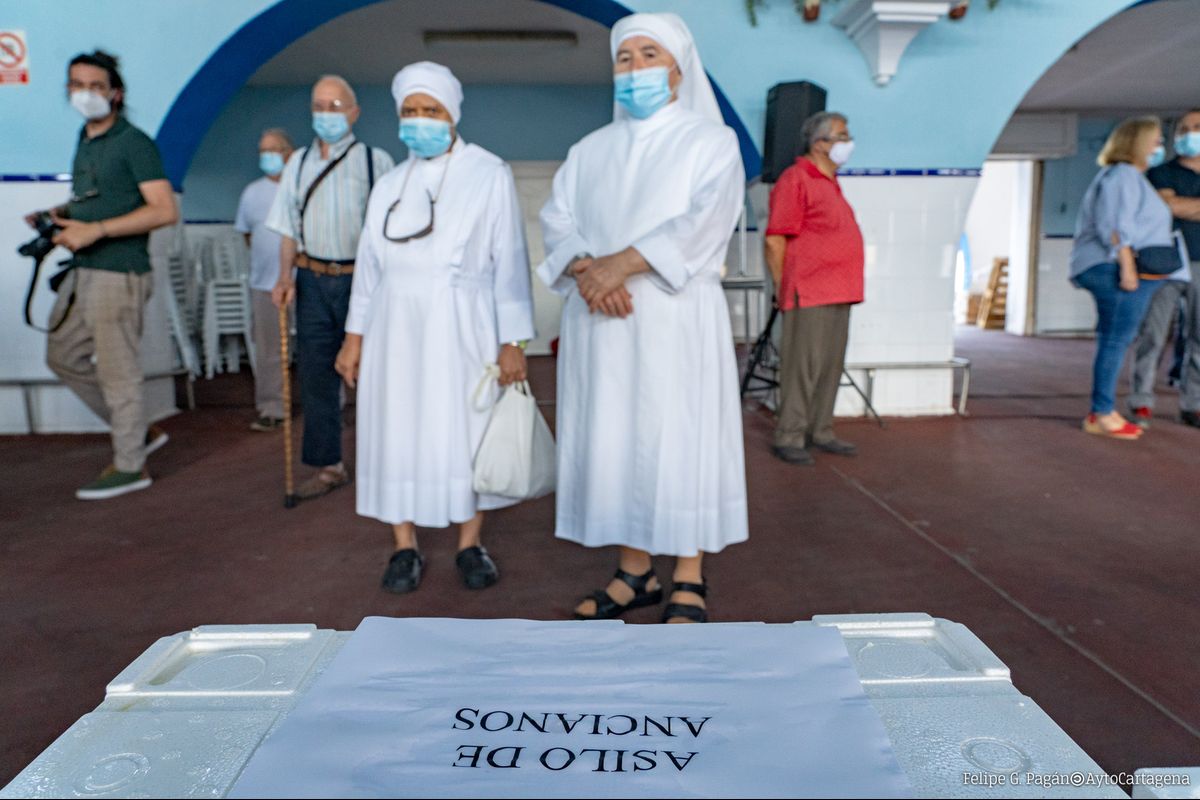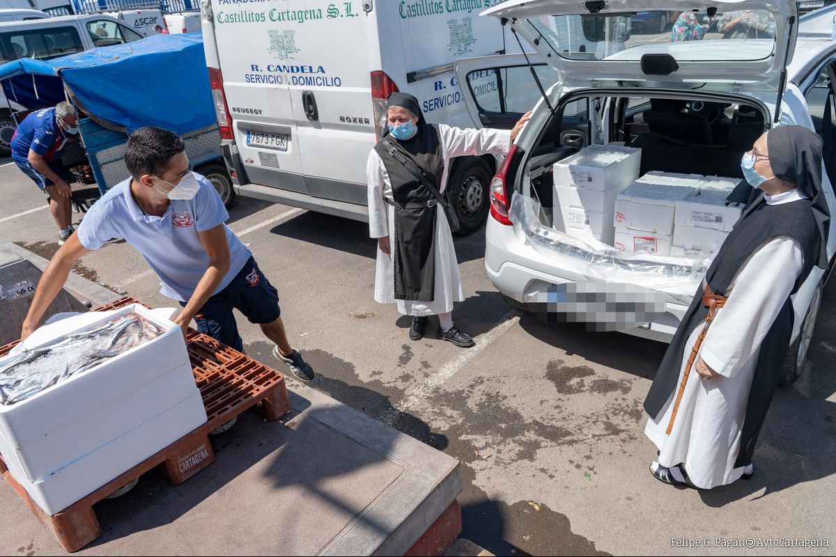 Como es tradición, con motivo de la festividad de la Virgen del Carmen, la Cofradía de Pescadores ha realizado la entrega de lotes de pescado a los centros benéficos de Cartagena, aunque en en un formato sin aglomeraciones, debido a la crisis sanitaria del Covid-19. En total se han repartido 720 kilos de pescado que ha incluido, bocalao, boquerón, sardina y dorada. Las nueve entidades que han recibido este lunes, 16 de julio, los lotes de pescado han sido: la Casa Cuna, Hospital de Caridad, Asilo de Ancianos, Hospitalidad Santa Teresa, Torre de Nazaret, Hermanas Cistencienses, Hogar de Betania, el Comedor Social Buen Samaritano y el Comedor Solidario "Jesús, Maestro y Pastor".
