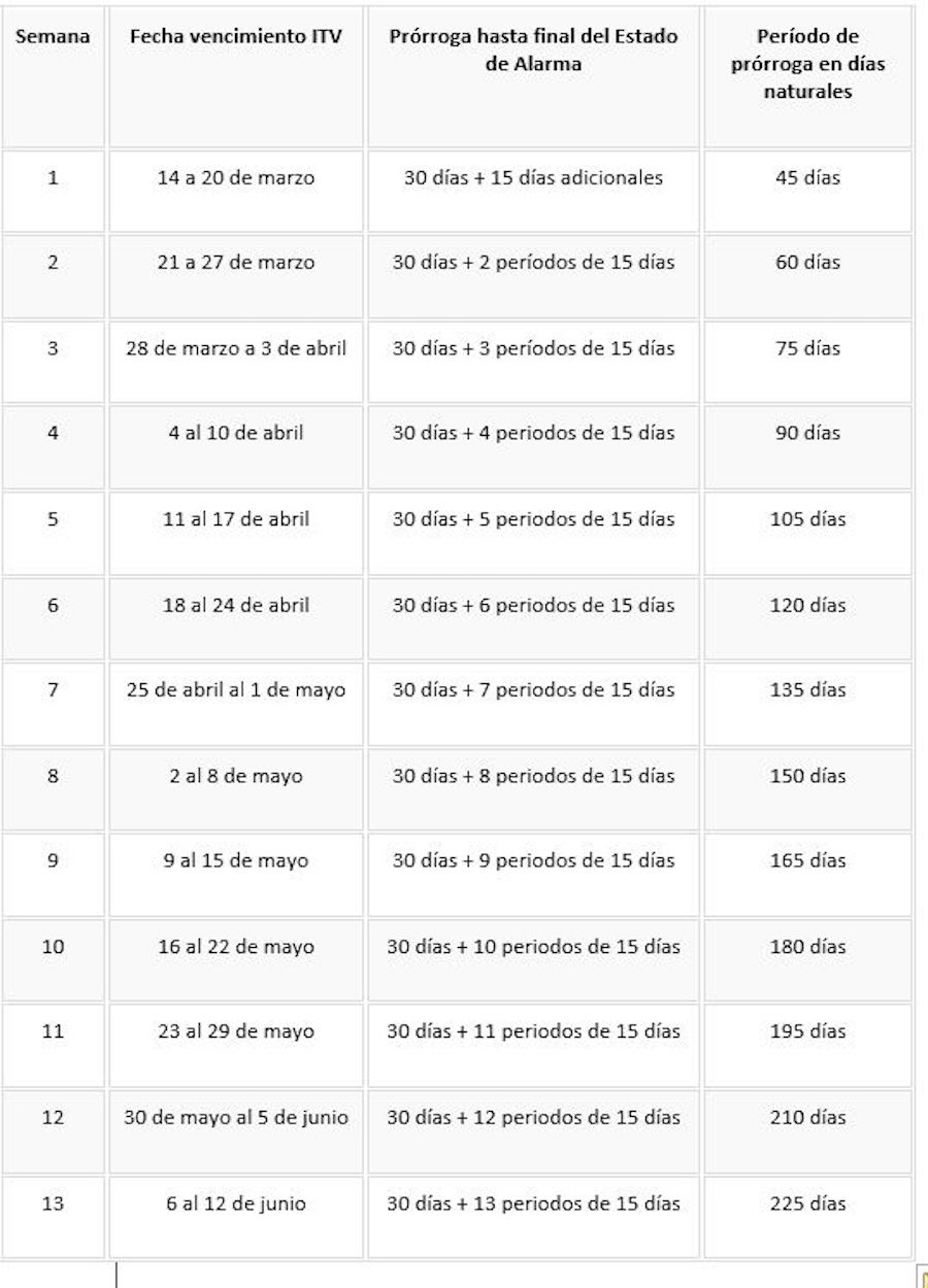 Los plazos para los vehículos cuya fecha de inspección técnica coincidiera con el Estado de Alarma cuentan con una prórroga de 30 días naturales para realizarla que se incrementan en 15 días adicionales por cada semana transcurrida desde el inicio de ese período hasta la fecha en que se hubiera producido el vencimiento. De esta forma, existen varios tramos para pasar la ITV que serán escalonados.