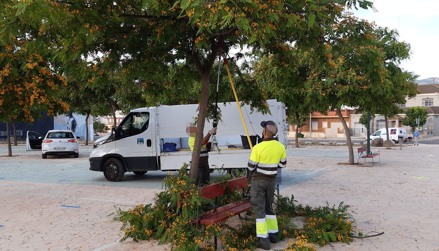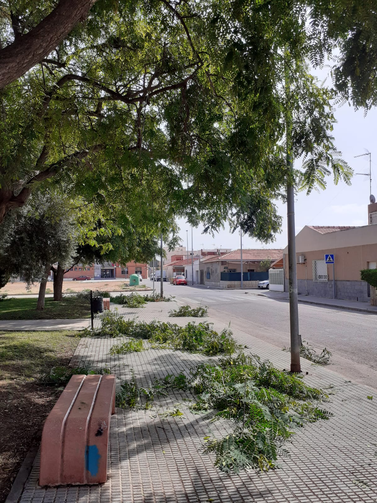 La UTE de Jardines está realizando diversos trabajos de desbroce, limpieza de parterres, realce de arbolado y zonas verdes, deshierbe manual de alcorques, limpieza, recorte de arbustivas, setos, podas de refaldeo del arbolado y poda de palmeras.