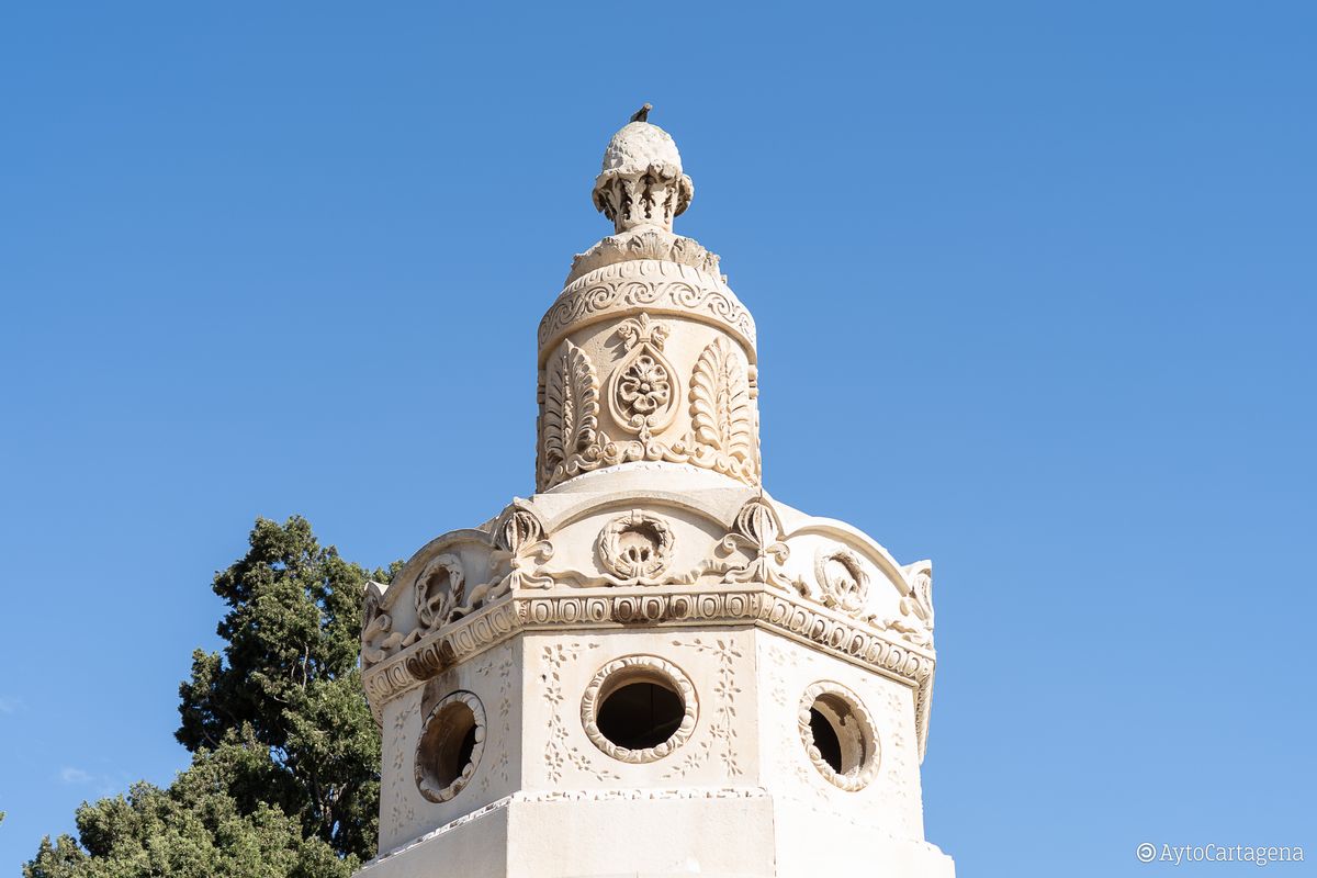 La rehabilitación del conjunto ha supuesto una inversión municipal de 37.268 euros y consiste en la limpieza y adecuación de los muros exteriores, las columnas de acceso al pórtico, las coronas, los óculos que rematan la edificación y toda la rejería artística que la rodea. “Gracias al gran trabajo de limpieza que están realizando nuestros técnicos de Patrimonio Arqueológico desde el lunes pasado, las esculturas ofrecen ya un color mucho más parecido al que tenían originalmente”, ha indicado la alcaldesa.