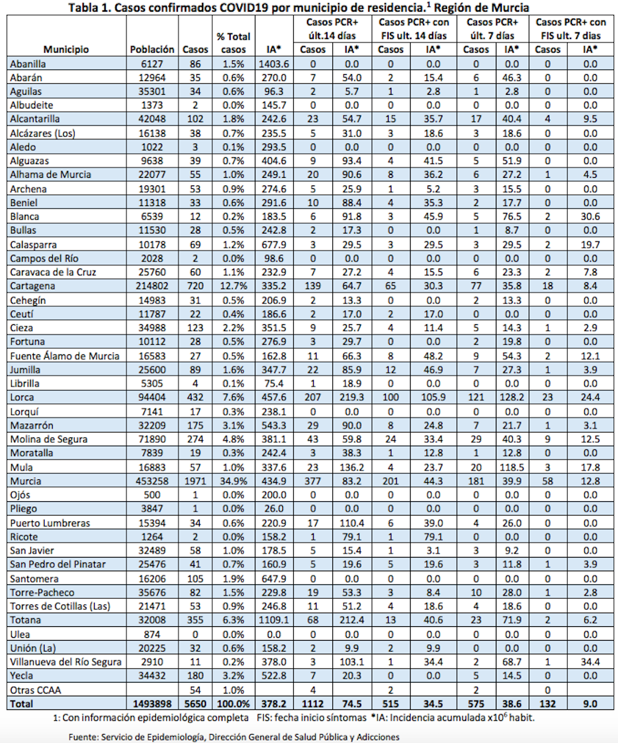 De los 97 nuevos casos, 30 corresponden al municipio de Murcia, 18 de Cartagena, 12 a Molina de Segura y 4 a Alcantarilla.