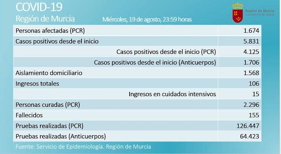 Los datos facilitados por el Servicio Murciano de Salud con fecha de ayer sitúan en 1.674 el número de afectados actuales en la Región tras 97 nuevos infectados. Los hospitalizados suben en 6 personas y bajan en 2 las presencias en UCI.