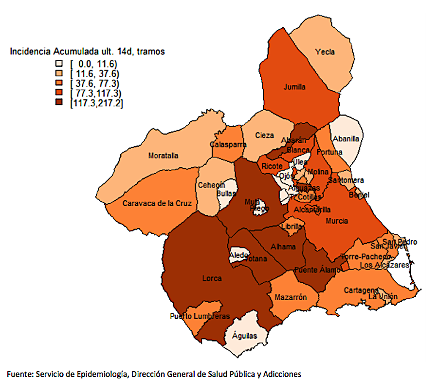 Barrio Peral, con 10; San Antón, con 9; y Los Dolores, son los de mayor incidencia. En la imagen, el mapa de incidencia regional en las últimas dos semanas.