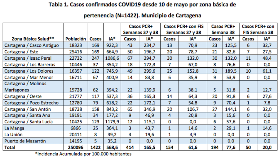 De los 445 nuevos casos, 145 corresponden al municipio de Murcia, 58 a Lorca, 42 a Cartagena, 32 a Molina de Segura, 31 a Jumilla, 11 a Torre pacheco, 11 a Las Torres de Cotillas, 11 a Totana, 9 a Alcantarilla, 9 a Archena, 8 a Ceutí, 7 a Alhama de Murcia, 7 a Caravaca de la Cruz, 6 a Fuente Álamo, 6 a Santomera, y 6 a Yecla. El resto están repartidos entre diversas localidades.
