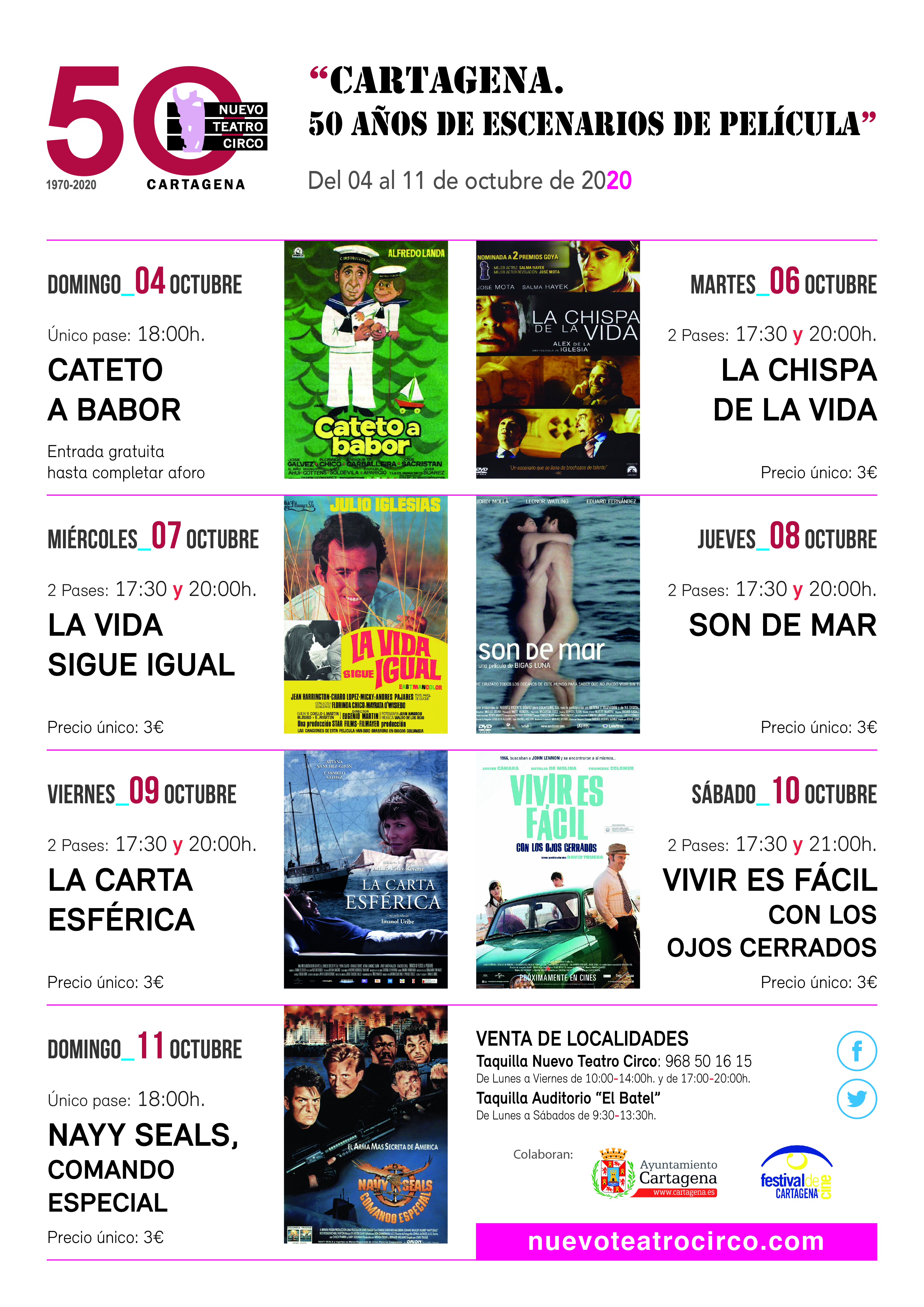 ‘Cateto a babor’ es la primera exhibición del ciclo ‘Cartagena. 50 años de escenarios de cine’, que recopila una serie de títulos de películas rodadas o relacionadas con Cartagena. La película protagonizada por Alfredo Landa se podrá ver en la pantalla del teatro un 4 de octubre, del mismo modo que se vio hace 50 años, otro 4 de octubre pero de 1970. La entrada es gratuita, previa reserva en la web del teatro o en la taquilla del propio teatro. Horario: de lunes a viernes, de 10:00 a 14.00 horas y de 17:00 a 20:00 horas.La programación del cincuenta aniversario del teatro cuenta con la colaboración de la Concejalía de Cultura del Ayuntamiento de Cartagena.