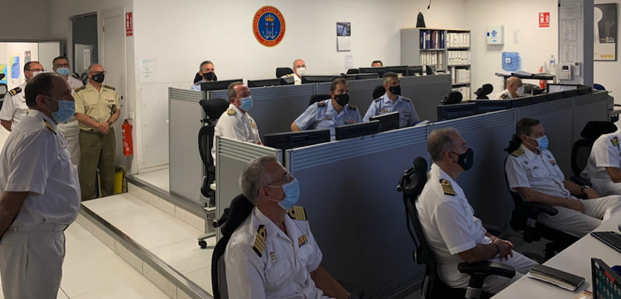 El general del aire Miguel Ángel Villarroya, ha realizado este viernes su primera presencia oficial en Cartagena, donde ha recorrido las diferentes instalaciones del cuartel general de la MOM y el centro de operaciones y vigilancia de Acción Marítima (COVAM). En la imagen, en la sala donde están los rastreadores de Covid de la Armada.El JEMAD ha estado acompañado durante la visita por el Almirante Jefe de Estado Mayor de la Armada (AJEMA), almirante general Teodoro López Calderón, el Comandante del Mando de Operaciones (CMOPS), teniente general Francisco Braco Carbó, y el Almirante de Acción Marítima, vicealmirante Juan Luis Sobrino Perez-Crespo como Comandante del Mando Operativo Marítimo.