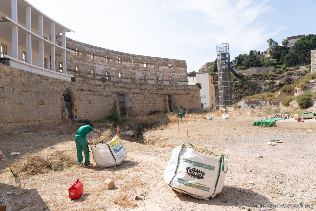 La concejalía de Patrimonio Arqueológico, que dirige la alcaldesa Ana Belén Castejón, ha iniciado ya las labores previas a la reanudación de las obras de la II fase del Anfiteatro Romano, que corresponde al cuadrante sur y permitirán recuperar la fachada marítima del yacimiento.Esta misma semana se han llevado a cabo las labores de limpieza, desbroce y acondicionamiento tanto de la zona interior como de la exterior, de forma que las obras puedan desarrollarse con normalidad a partir del próximo lunes. “Nuestro objetivo es continuar avanzando en la recuperación y consolidación de este yacimiento, así como en la puesta en valor del impresionante patrimonio arqueológico con el que cuenta Cartagena”, ha señalado la alcaldesa.