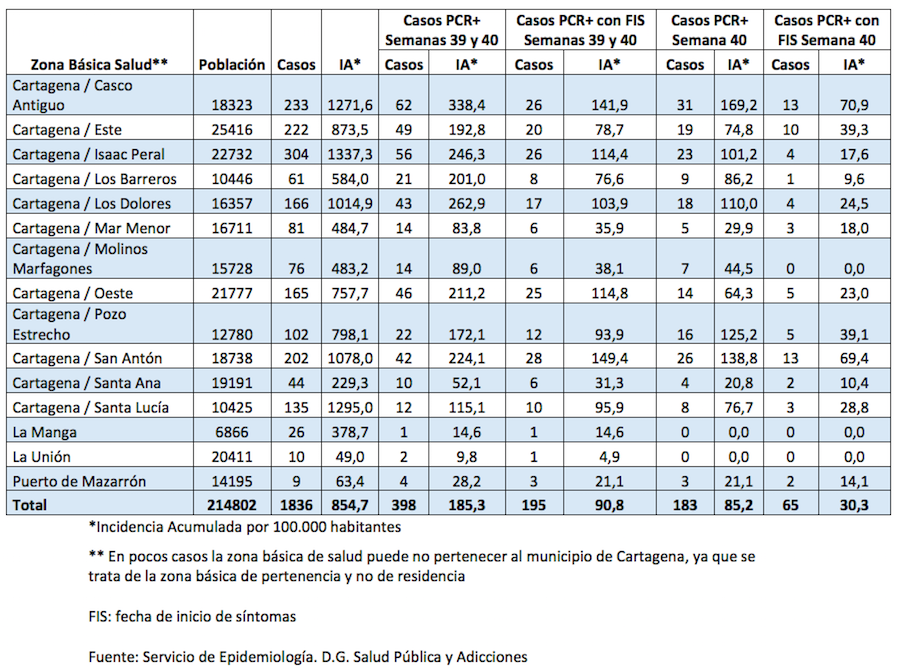 Respecto a Cartagena, las cifras totales de casos positivos desde el 10 de mayo son 1.689 según residencia y 1.836 según acumulados en centros de salud. La incidencia en la última semana es de 198, inferior a los datos de la anterior (239). Sí se confirma que los menores de 40 años son los más afectados en esta segunda ola, especialmente de la adolescencia a la juventud.