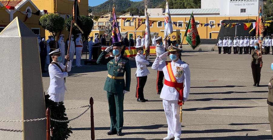 La Armada ha realizado hoy un izado solemne de bandera conjunto y un homenaje a los que dieron su vida por España, en la base de submarinos del Arsenal Militar de Cartagena.