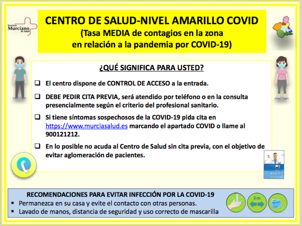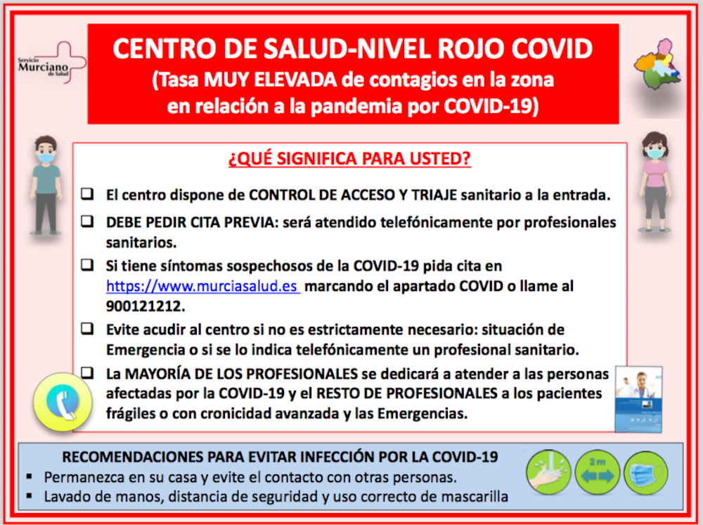 El centro de salud ha registrado 55 positivos y 83 contactos en los últimos 7 días, por lo que está en la fase de tasa muy elevada de casos, mientras que el resto de centros de salud del municipio de Cartagena están en fase amarilla, que corresponde a la tasa media de infectados.En la actualidad, se encuentran con tasa elevada de casos, nivel rojo, del Área II de Salud: