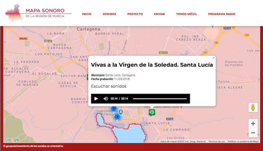 Es una iniciativa del proyecto ‘Patrimonio digital’ de la Fundación Integra para la conservación de archivos de audio singulares, como los de fiestas populares, celebraciones religiosas o tradiciones centenarias, teniendo ahora mismo más de 500 sonidos representativos. A través de la web sonido.patrimonio.digital, el usuario puede escuchar, por ejemplo y en lo referente a nuestro municipio, al afilador, el ambiente de la afición del Efesé con júbilo por un gol, sonidos de batalla y desfiles de Carthagineses y Romanos y, entre otros, los vivas a la Virgen de la Soledad de Santa Lucía.El mapa interactivo que conserva y difunde sonidos representativos de la Región de Murcia cuenta ya con un total de 561 archivos de audio, para acercar a los ciudadanos el testimonio sonoro de fiestas populares, celebraciones religiosas, tradiciones centenarias y eventos de diversa índole de los 45 municipios. Esta iniciativa, denominada Mapa Sonoro de la Región de Murcia, se enmarca en el proyecto ‘Patrimonio digital’ de la Fundación Integra, adscrita a la Consejería de Presidencia y Hacienda.