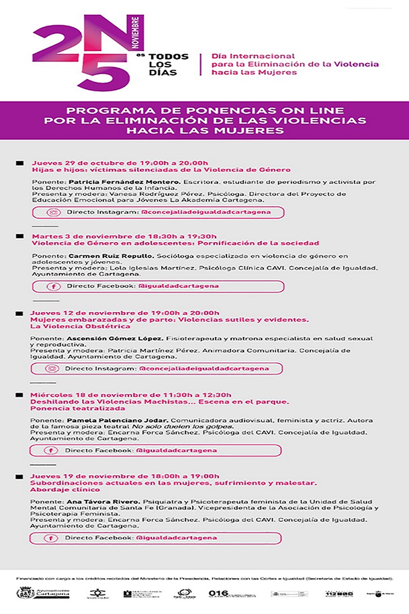 La concejalía de Igualdad del Ayuntamiento de Cartagena, lanza una campaña especial con motivo del ‘Día internacional para la eliminación de la violencia hacia las mujeres’, que en esta ocasión tiene como epicentro al Centro de Atención a Víctimas de Violencia de Género y que, debido a la pandemia del coronavirus, se desarrollará de forma virtual. Un año más, el Ayuntamiento de Cartagena, a través de la Concejalía de Igualdad, organiza una campaña para conmemorar el Día Internacional para la eliminación de la violencia hacia las mujeres. Este año será diferente debido a la COVID-19 y, por eso se ha desarrollado un programa de ponencias online que comenzará este jueves 29 de octubre.