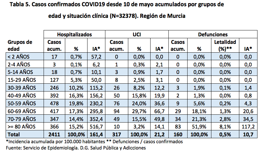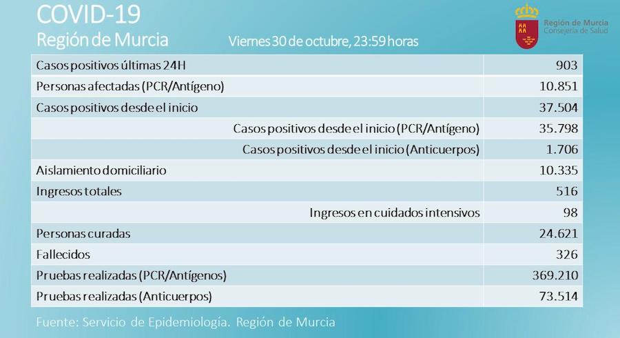 De los 903 nuevos casos, 300 corresponden al municipio de Murcia, 64 a Cartagena, 44 a Alcantarilla, 38 a Lorca, 37 a Molina de Segura, 37 a San Javier, 33 a Torre Pacheco, 31 a Yecla, 26 a Jumilla, 23 a Caravaca de la Cruz, 22 a Alhama de Murcia, 21 a San Pedro del Pinatar, 19 a Archena, 15 a Totana, 13 a Cehegín y Villanueva del Río Segura, 12 a Cieza, Mazarrón y Las Torres de Cotillas, 11 a Fuente Álamo y Moratalla, 9 a La Unión, 8 a Los Alcázares y Ceutí, 7 a Bullas, Fortuna y Puerto Lumbreras, 6 a Alguazas y Lorquí, 5 a Águilas, Blanca, Librilla, Mula y Santomera. El resto están repartidos entre diversas localidades.