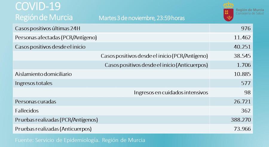 El Servicio de Epidemiología de la Consejería de Salud notificó 976 nuevos casos en el día de ayer. De ellos, 321 pertenecen al municipio de Murcia, 56 a Cartagena, 52 a Molina de Segura, 38 a Lorca, 35 a San Javier, 34 a Archena, 33 a Alcantarilla, 30 a Caravaca de la Cruz, 28 a Yecla y 26 a Torre Pacheco. El resto está repartido entre el resto de municipios de la Región. En el día de ayer se realizaron 6.362 pruebas PCR/Antígenos.